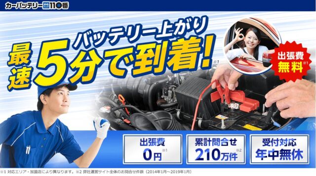 カーバッテリー110番は、自家用車のバッテリーあがりで困った時に連絡すると、各地のスタッフが最短5分で現地に駆けつけます。