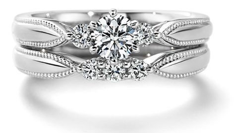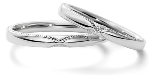 エンゲージリングもマリッジリングもともに、メレダイヤモンドから側面に入るミル打ちが特徴的です。