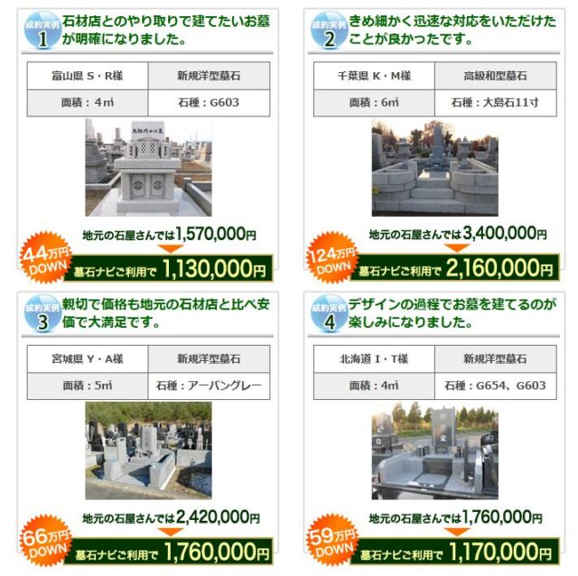 審査も無いので、石材店の質はそのサイトというより石材店自体がハズレだったのだと思います。そこで、情報だけはサイトで集めて、そのサイトは通さずに各社で競合させた方がずっと値引きしてくれます。