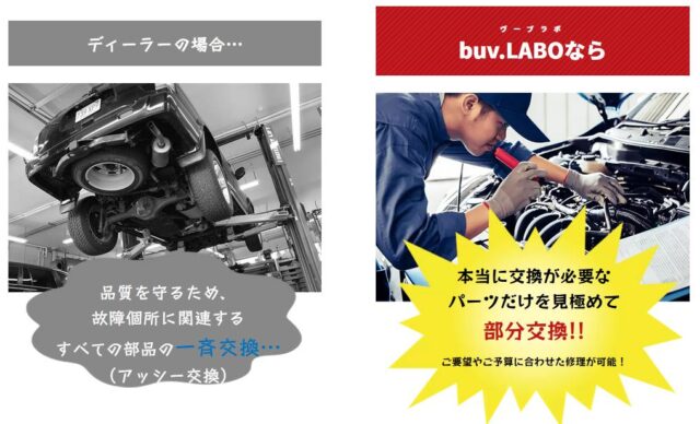 buv.LABO(ヴーブラボ)の修理や点検、整備は、中間マージンがない分だけ、ディーラーに依頼するよりも安く済む場合が多いです。