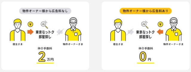 仲介手数料は、物件オーナー(貸主)が、東京なっトク部屋探しに広告料を支払っているかどうかで決まります。