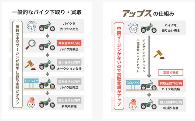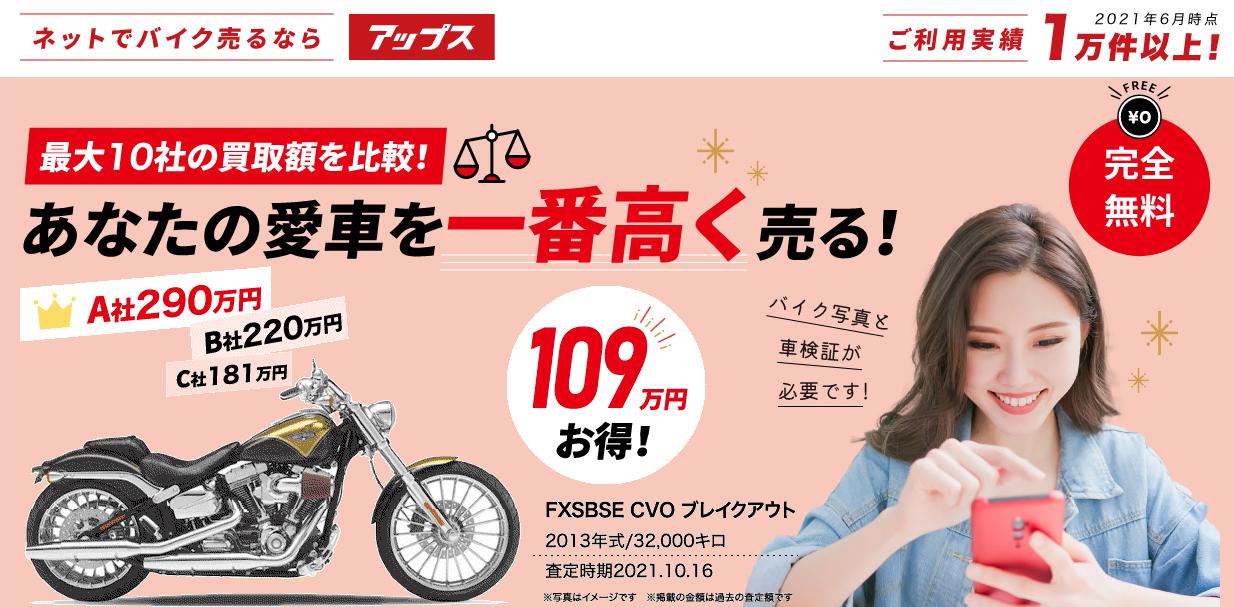 アップスと従来バイク買取比較サービスの違いで言うと、一括査定の方が比較的早く売れ、アップスの方が高く売れる点にある。