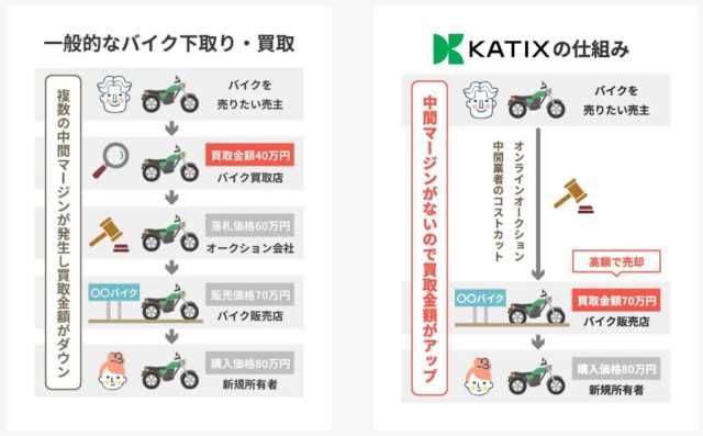 一方、バイク販売店はKATIX(カチエックス)で仕入れてそのまま販売する場合が多く、中間マージンが減ることで査定額アップにつなげやすいのです。