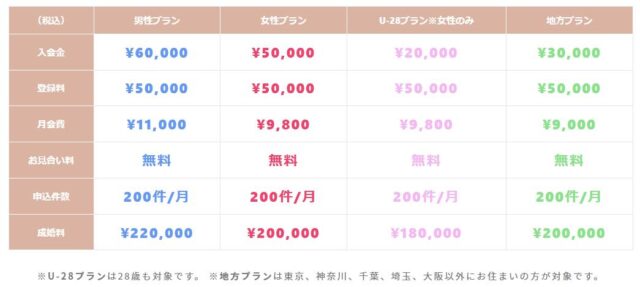 一般的な結婚相談所の相場と比べて、初期費用・月額費用は安め、成婚退会料は高めに設定されています。
