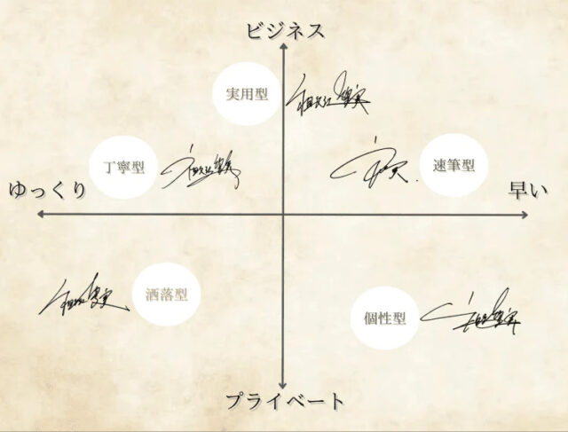個性型はデザイン重視で筆順の前後があり、アウトラインに特長があるユニークな書体となります。粋な大人を目指すために、すべての書体をマスターしてみたいものです!