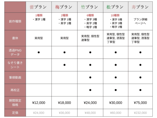 あなたが希望する書体や種類、書き方を解説した動画、再校正などの有無によって、5種類のプランを用意しています。