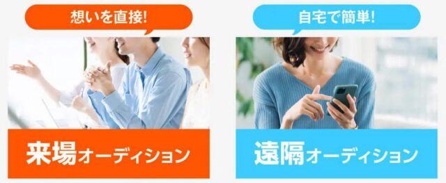 対面の場合は、東京・名古屋・大阪で開催されるオーディションに参加する必要がある一方、遠隔の場合は指定された文章を朗読し、その音声・動画を送付するだけで構いません。