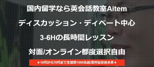 (株)Rが運営する「Aitem」(アイテム)は、1回あたり3時間~6時間という長時間レッスンを行う英会話スクールです。