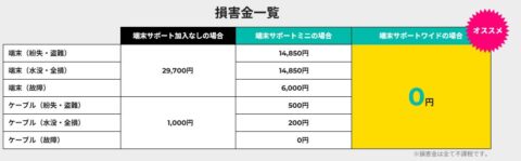 弁償費用は端末が29,700円、USBケーブルが1,000円となっていますが、端末サポートに加入すると50%~100%OFFになります。