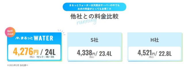 まるっとWATERは、RO水などを提供する宅配水業者と比べると割高ですが、天然水のなかでは最安値ではないとしても、比較的安めな水準です。