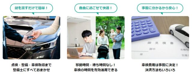検査場・整備場などに持ちこむ必要がなく、代車の手配などもしなくていいので、時間を有効活用できます。