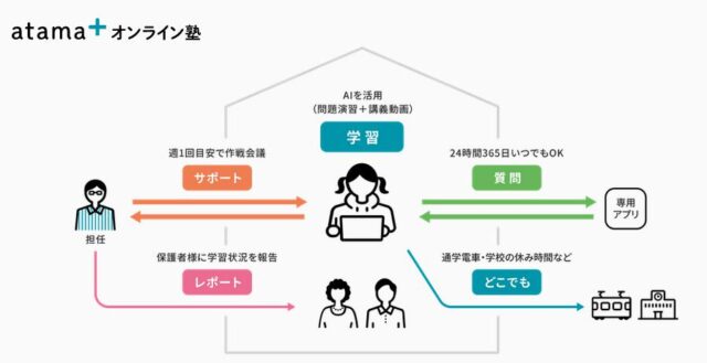 atama plus(株)が運営する「atama+アタマプラスオンライン塾」は、マンツーマンAI教材「atama+」と担任(スタディトレーナー)によるサポートがセットになったオンライン講座です。