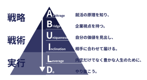Abuild就活では、独自の「就活成功のフレームワーク」である「ABUILD」を提唱しています。