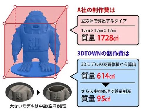 3DTOWNの料金は、フィギュアの体積で計算されるため、立方体で計算する他社と比べると、大幅に安い料金になります。