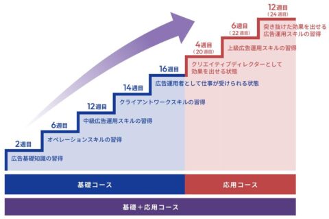 また、エキスパートコース(応用コース)では、広告運用で圧倒的な成果を上げるだけでなく、広告のクリエイティブスキルやマーケティング戦略を高めていきます。