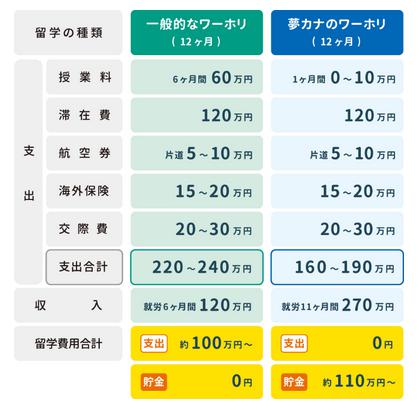 最終的に、「留学・ワーホリ先での労働で得られる報酬」のほうが「夢カナ留学に支払う費用」を上回ることで、実質0円を実現しています。