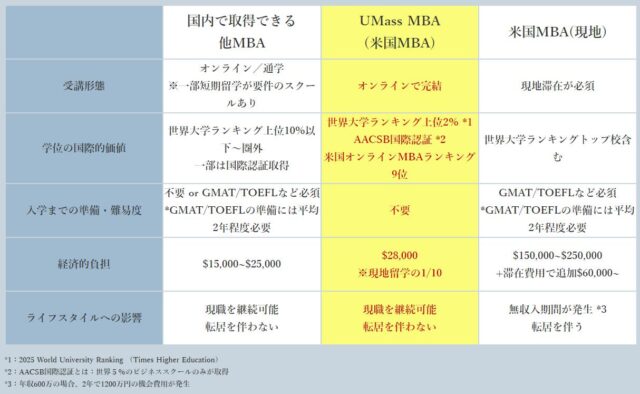 マサチューセッツ州立大学に留学してMBAを取得する場合と比べると、費用は10分の1程度と圧倒的に安く済みます。