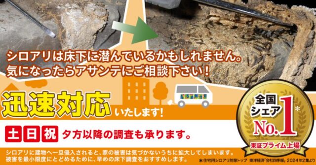 最短で依頼日当日中にアサンテの社員が訪問し、シロアリがいるかどうかの床下調査を無料でおこないます。