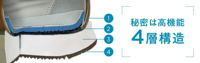 特許技術を用いた、以下の4層構造ソールにより実現しています。