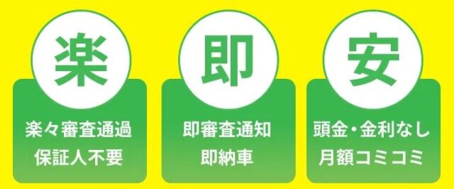 最短即日で審査結果が判明し、頭金・金利・保証人不要(一部ケースを除く)で最大60回払い(5年)などの有利な条件で返済できます。