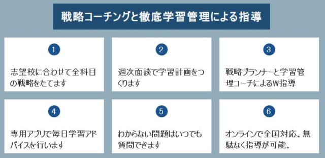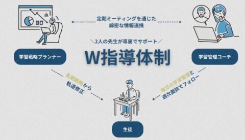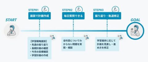 受験や教材戦略などの長期戦略は「学習戦略プランナー」が担当し、毎週のオンライン面談や日々の学習管理は「学習管理コーチ」が担当します。