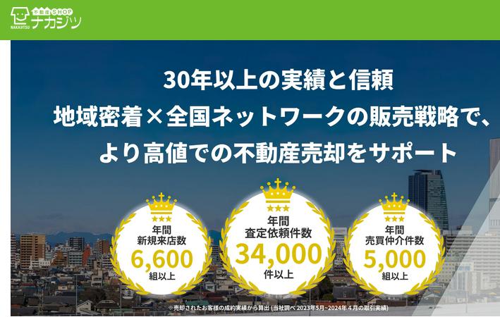 不動産SHOPナカジツは1987年の設立以降、地域密着型の不動産業者として、限られたサービスエリアでありながらも、年間34,000件以上の査定依頼を受けています。