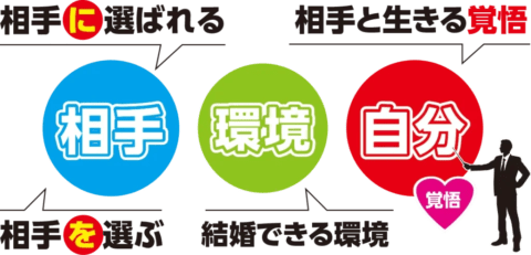 独自の「for M メソッド」により、結婚に必要な3つの要素(相手・環境・自分)を集めていきます。
