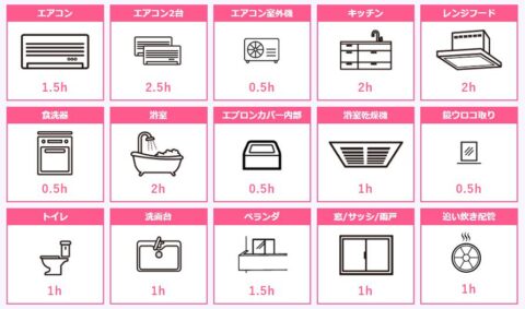 アールクリーニングの激トク6時間パックは、作業時間が6時間以内であれば、エアコンクリーニングやキッチン、水回り、トイレ、窓など、さまざまな場所のハウスクリーニングを行えます。