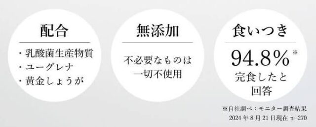 その他にも、黄金しょうがやユーグレナ、乳酸菌生産物質なども配合しており、栄養バランスを整えています。