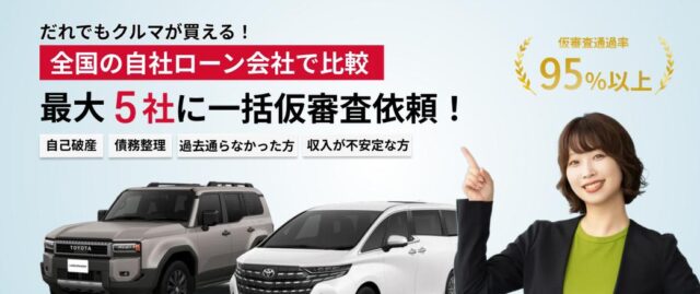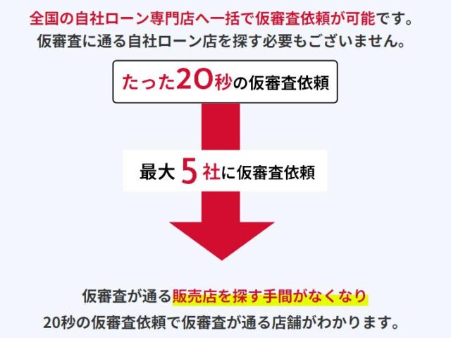 仮審査通過率は95%以上と高く、自社ローンを扱う自動車販売店を探す手間と、1社ずつ個別に審査を申し込む必要がなくなります。