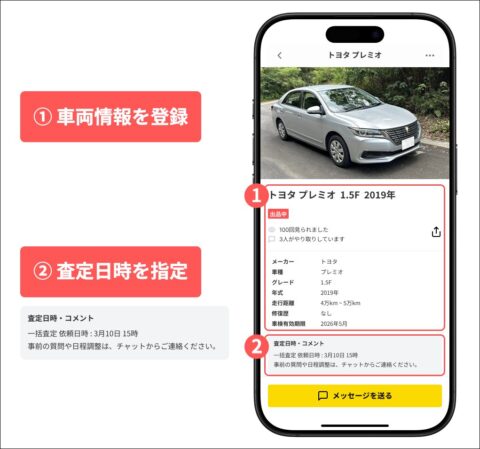 中古車買取業者とは、テキストチャットで査定日時・場所を決められるため、複数の買取業者とやり取りする場合でもスムーズに行えます。