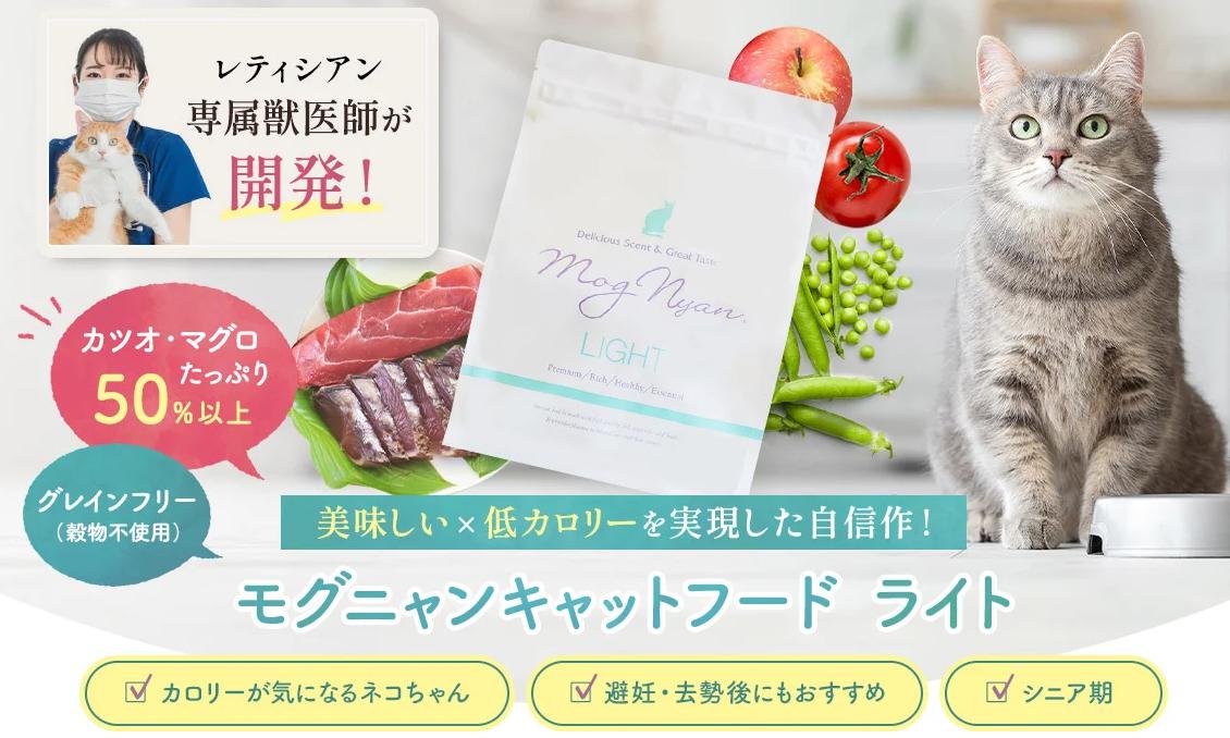 (株)レティシアンが販売する「モグニャンキャットフード ライト」は、おいしさと低カロリーを両立するために開発されたキャットフードです。