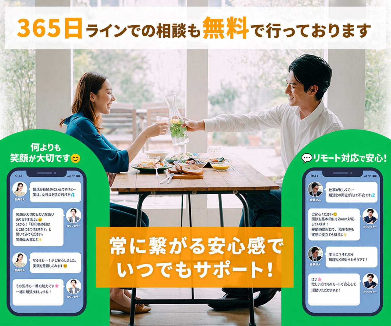 男女1名ずつのカウンセラーによるダブルサポートにより、同性・異性それぞれからのアドバイスやサポートで婚活成功をアシストします。