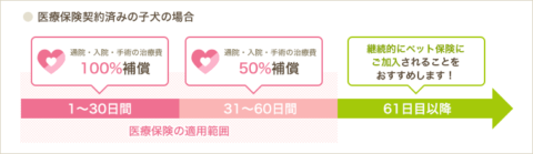 医療保険を契約しているブリーダーから子犬を購入すると、補償対象となる病気やケガに対して、購入日より30日間は医療費を100%補償、31日目以降60日目までは50%の補償が受けられます。