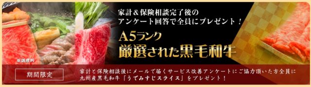 家計と保険に関する相談を終えた後にメールで届くアンケートに答えると、全員がもれなく当選となり、九州産黒毛和牛がもらえると言う内容です。