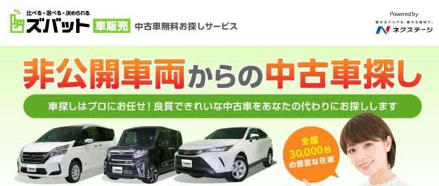 「ズバット」というと、ズバット車買取のイメージが強いかと思いますが、ネクステージと提携して「ズバット車販売」(旧:ズバブーン車販売)として中古車販売も行っています。