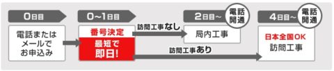 なお、その電話番号が使えるようになるには工事が必要なため、回線の種類や工事の内容によっては、電話番号が使えるようになるまでの日程は異なります。