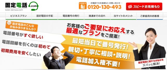(株)メンバーズネットが運営する固定電話ドットコムは、最短で申し込んだ当日に固定電話の電話番号が発行できる(手続きの代行。固定電話ドットコム自身は電話番号を発行しません)だけでなく、あなたの固定電話番号の活用法に応じた最適な料金プランや契約をアドバイスしてくれる仲介業者です。