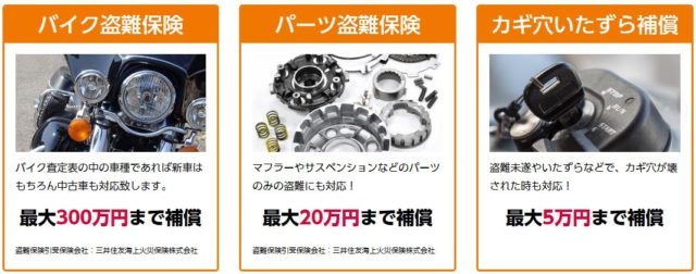 付帯保険にはパーツ盗難保険と鍵穴いたずら補償が付いていて、おすすめのバイク盗難保険です。